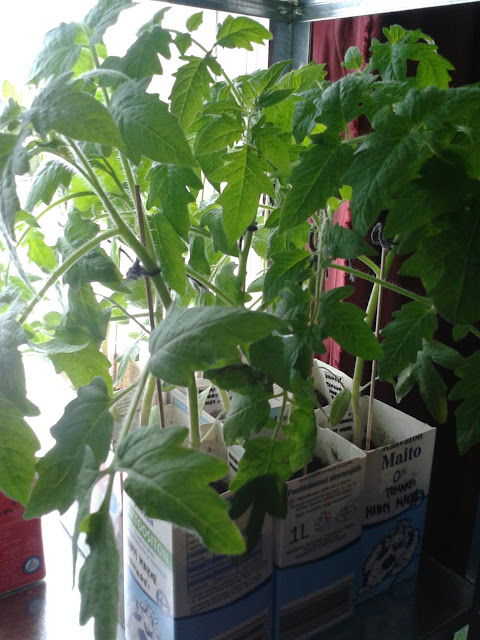 Nämä kaverit saivat sisälle jäädä vielä kasvamaan ainakin pariksi viikoksi, riippuen tietty mitä säät tuo tullessaan, runko tomaatit kasvoi yllättävän tukeviksi, samaa ei voi kyllä sanoa päärynä ja kirsikka tomaateista, voipi olla että kirsikka tomaatit lähtee kompostiin ja joutuu tyytymään kaupan taimiin, päärynä tomaatit tosin harmittaa niitä kun ei pahemmin ole taimina näkynyt myynnissä ja oishan noita ollu hauska koittaa, no toivotaan että ainakin yksi taimi säilyisi edes kohtalaisena