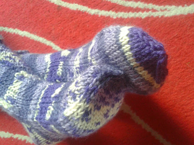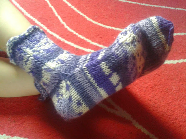 Taas tuli yhdet pikkuolgat tehtyä, tällä kertaa lankana on 7 Veljestä Polkka (väri 870) jota löytyi pari pientä jämä palloa viimevuotisista sukista. Kerroinkin aiemmin jo että ennen en edes pitänyt koko mallista nyt niitä syntyy kuin sieniä sateella :) (tosin kaikki reiättöminä. Ohjehan löytyy edellisestä postauksestani Täältä.